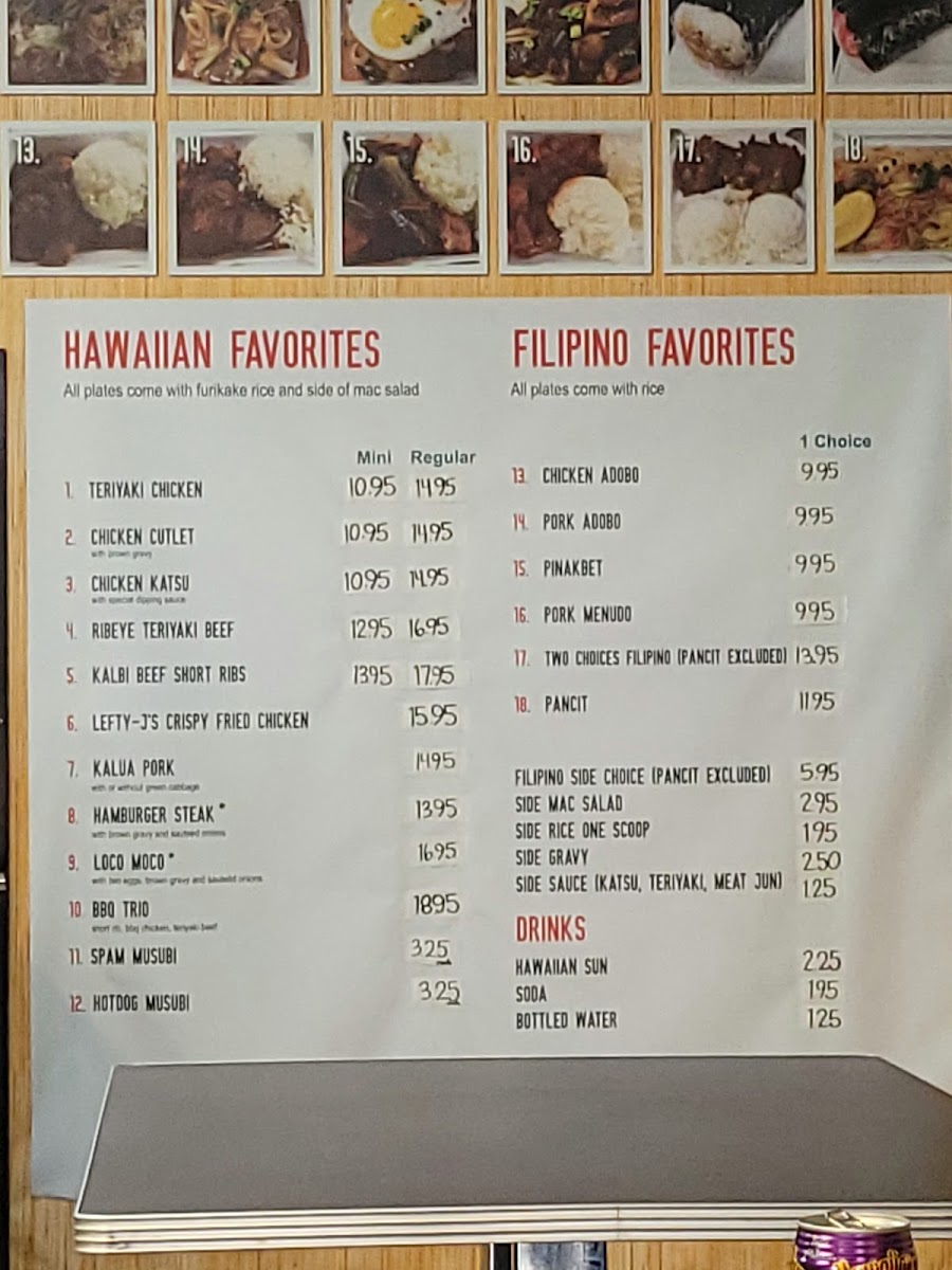 The menu at LEFTY-J’S ISLAND FAVORITES Restaurant #2 offers a diverse selection of Asian fusion dishes with a focus on Filipino and Hawaiian cuisine. It features a range of options suitable for casual dining, including hearty main courses, traditional favorites, and convenient take-home items.
