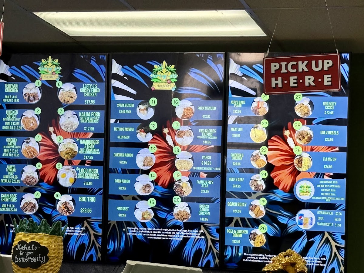 Menu highlights include dishes such as Kalbi & Garlic Chicken, Chicken Katsu, Spam Musubi, Meat Jun, and Pinakbet with rice. The range of offerings covers traditional Filipino and Hawaiian comfort foods and fusion items with an emphasis on savory proteins and rice-based sides. The menu supports both dine-in and take-home options.